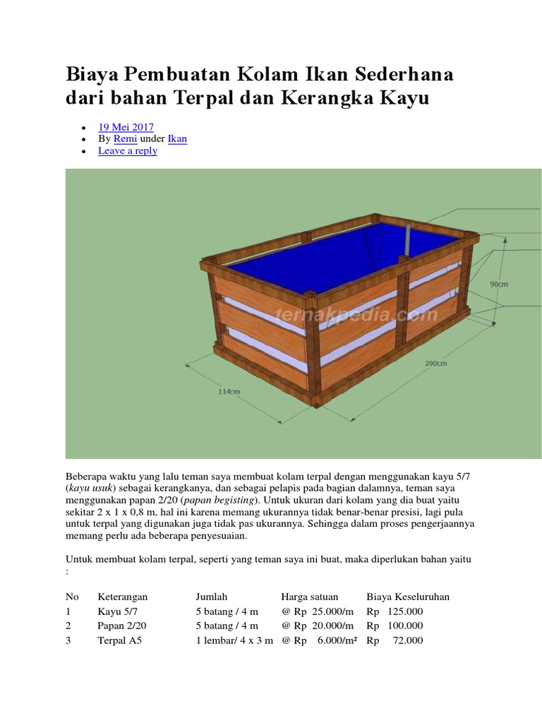 Terdapat 2 jenis kolam terpal yang dibuat di dalam tanah. Biaya ternak lele kolam terpal merupakan hal utama yang harus diketahui jika kamu ingin memulai ternak lele di kolam terpal karena itu akan menjadi pertimbangan utama apakah usaha ternak lele terpal yang ingin kamu mulai bisa menghasilkan keuntungan besar atau tidak. Beberapa waktu yang lalu teman saya membuat kolam terpal dengan menggunakan kayu 5 7 kayu usuk sebagai kerangkanya dan sebagai pelapis pada bagian dalamnya teman saya menggunakan papan 2 20 papan begisting untuk ukuran dari kolam yang dia buat yaitu sekitar 2 x 1 x 0 8 m hal ini karena memang ukurannya tidak benar benar presisi lagi pula untuk terpal yang digunakan juga tidak pas. Selain sangat efektif juga efisien karena mudahnya dalam cara membuat kolam terpal untuk budidaya ikan lele juga masalah modal biaya pembuatan terpal sangat terjangkau.