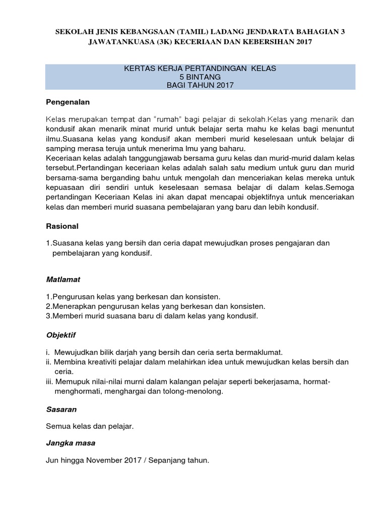Kertas Kerja Pertandingan Kebersihan Dan Keceriaan Kelas Sk