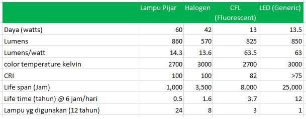 Perbandingan Cahaya Watt Harga Lampu Led Cfl Dan Lampu Pijar Hemat Mana K Blog