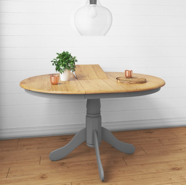 Penelope Grey Painted W Oak Top Round Pedestal Extending Dining Table Progressive Furnishings