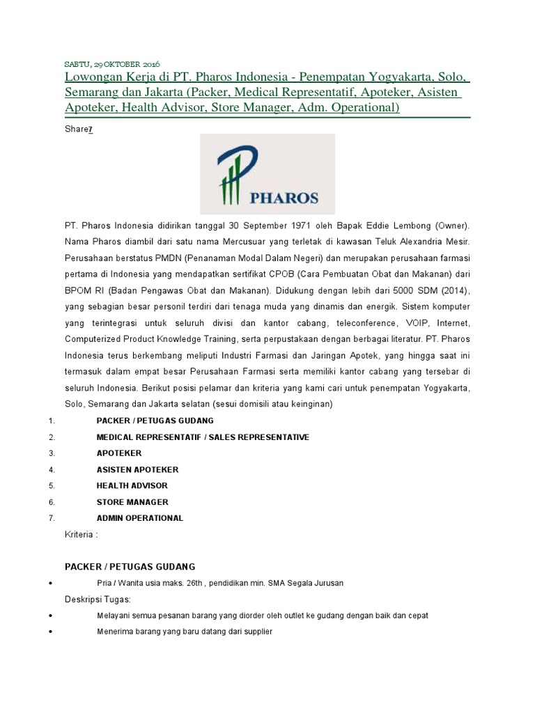 Mb anisa aku mau tanya nih aku kan dapat panggilan dari pt pharos dan aku milih jalur exspress dan disitu udah ada alamat tempat aku interview sekaligus kerja tapi saat aku ke apotek yang sesuai dengan alamat di email aku pihak apoteknya belum mau menerima saya dengan alasan belum ada konfirmasi dari pihak pt pharosnya ke apotek tersebut dan di email saya juga tidak dicantumin no hp. Lowongan kerja farmasi batam pt. Pharos indonesia didirikan tanggal 30 september 1971 oleh bapak eddie lembong. Jika ba lebih banyak bekerja di toko maka beauty promotor lebih sering mobile mengurusi branding event seperti bazaar pameran beauty class atau kerja sama dengan instansi.